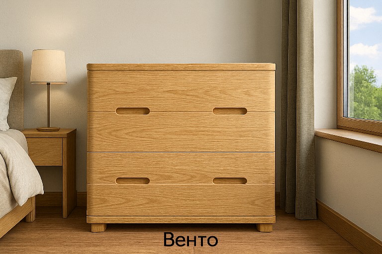 Комод Венто . Отличается лаконичным дизайном и высокой надежностью. Плавные линии фасада и натуральная структура древесины создают атмосферу уюта и комфорта. Компактен и вместителен одновременно — идеально подходит для небольших помещений. Благодаря использованию натурального материала, комод легко сочетается с другой мебелью вашего интерьера. Удобное расположение ящиков обеспечивает легкий доступ к хранящимся вещам.